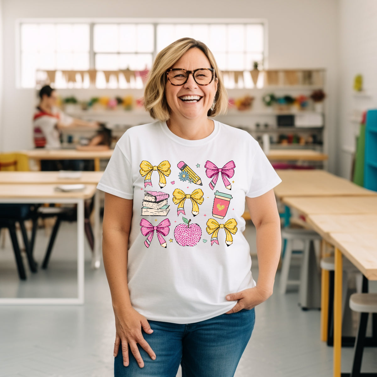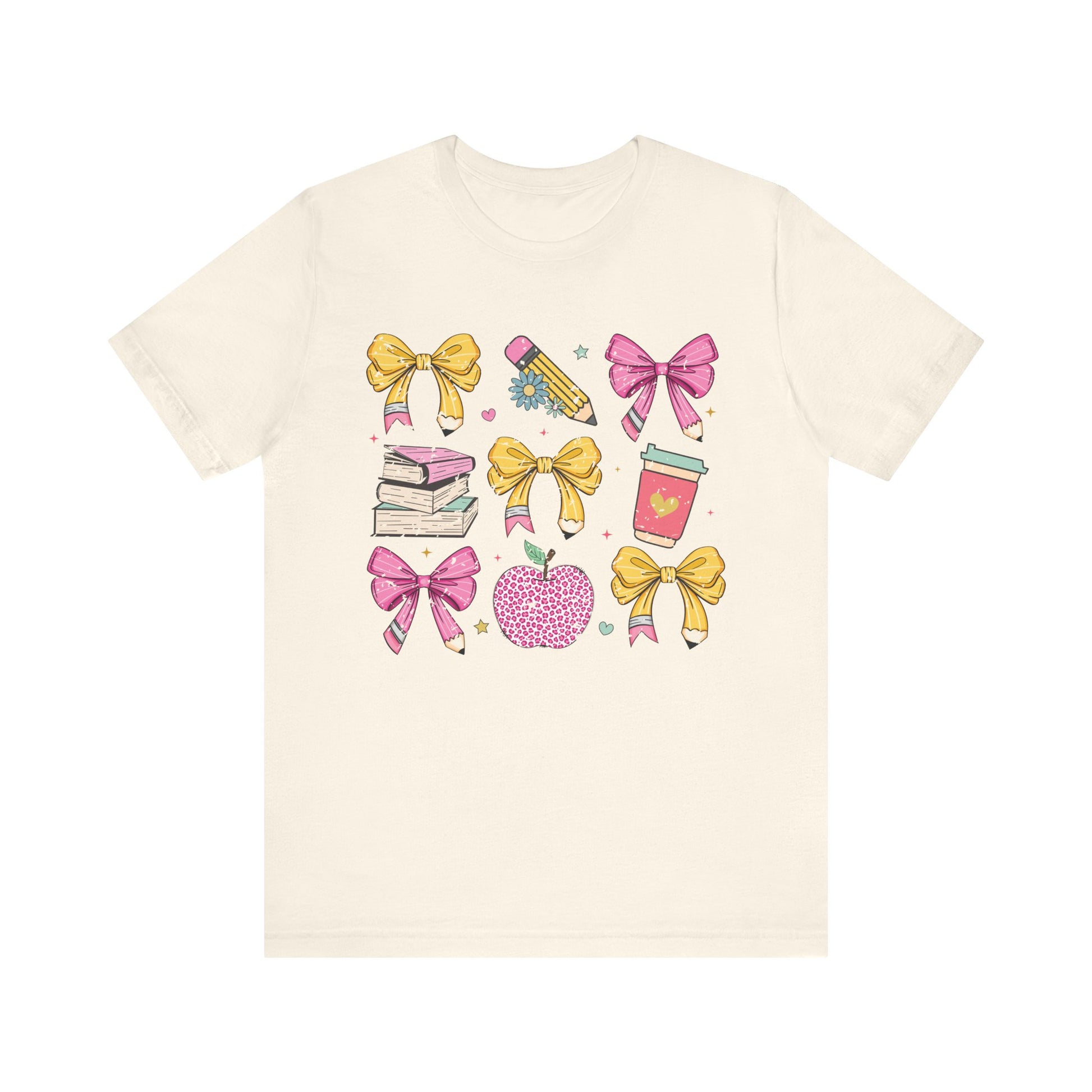 Embrace your love for learning with this delightful Unisex Jersey Short Sleeve Tee! With its soft, breathable fabric and playful design featuring vibrant bows and school-themed icons, this tee brings a light-hearted vibe perfect for both casual outings and cozy days at home. Ideal for teachers, students, or anyone who appreciates a fun take on educational themes, it can easily transition from classroom to brunch with friends. Whether you’re preparing for back-to-school season, celebrating Teacher Appreciation Week, or simply wanting to showcase your passion for education, this shirt is a charming addition to any wardrobe.