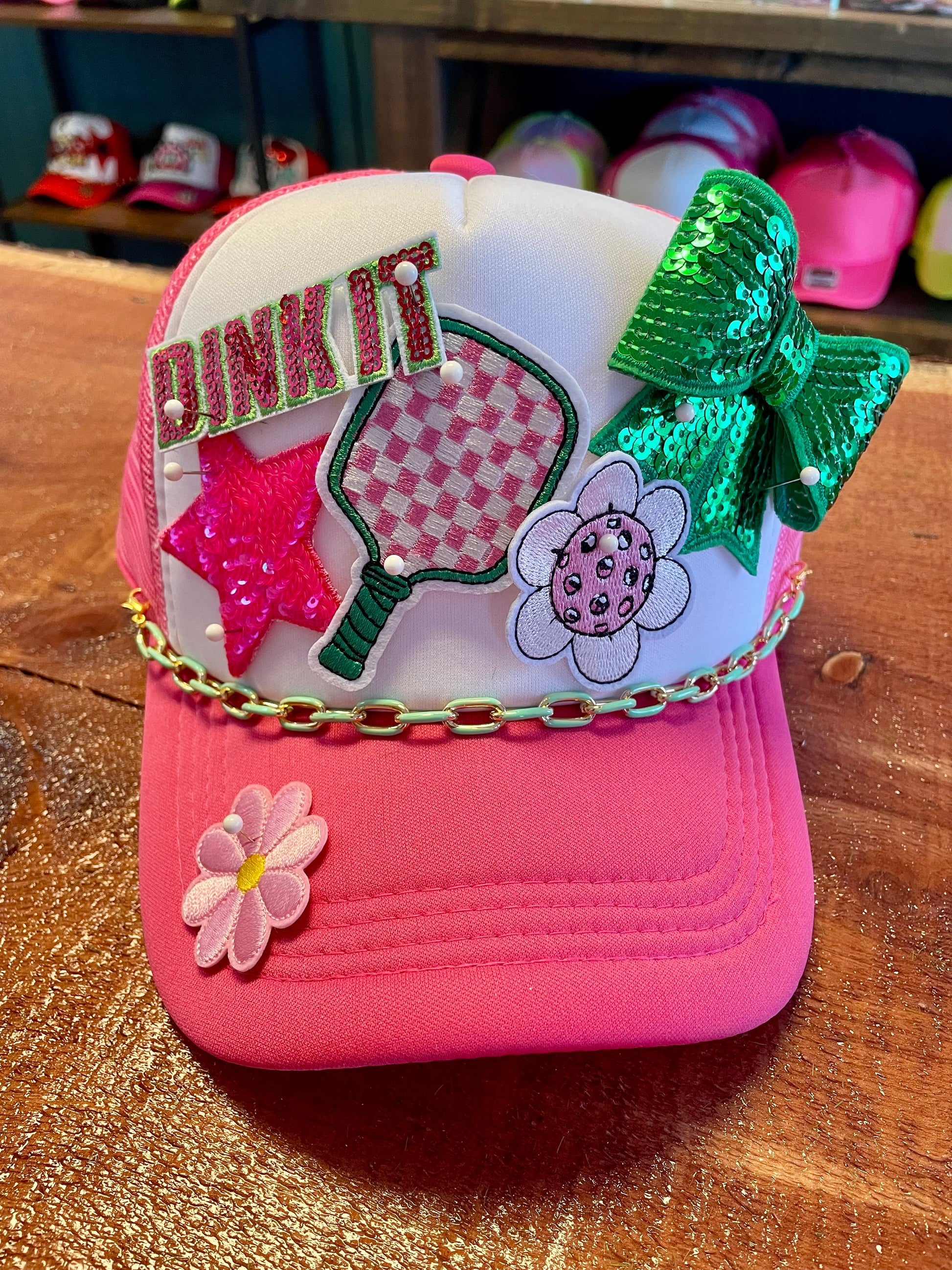 Get ready to serve up some serious style with the Dink It! Trucker Hat! This playful hat features a fun pickleball design in a vibrant pink and green color scheme. With floral accents, this hat is both funky and functional, making it perfect for your next game or everyday wear.