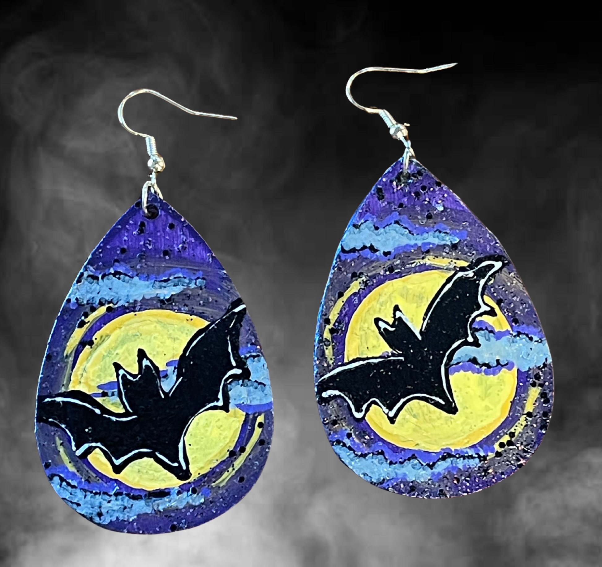 Get in the Halloween spirit with our Going Batty Earrings. Made with a purple background and hand-painted spooky clouds, these lightweight and hypoallergenic earrings feature flying bats and a glowing moon. Perfect for a fun and festive touch to any outfit. Boo!