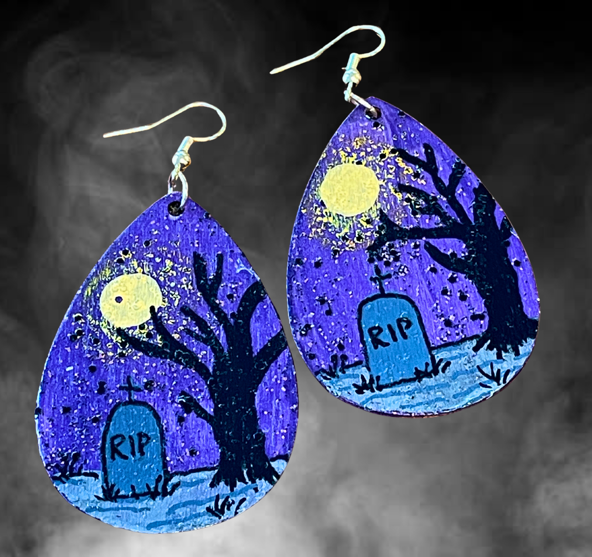 Light up the night with these RIP earrings! The purple glowing moon and spooky tree against a graveyard scene will add a spooky touch to any outfit. Hand painted and hypoallergenic, these lightweight earrings are perfect for all your haunted adventures.