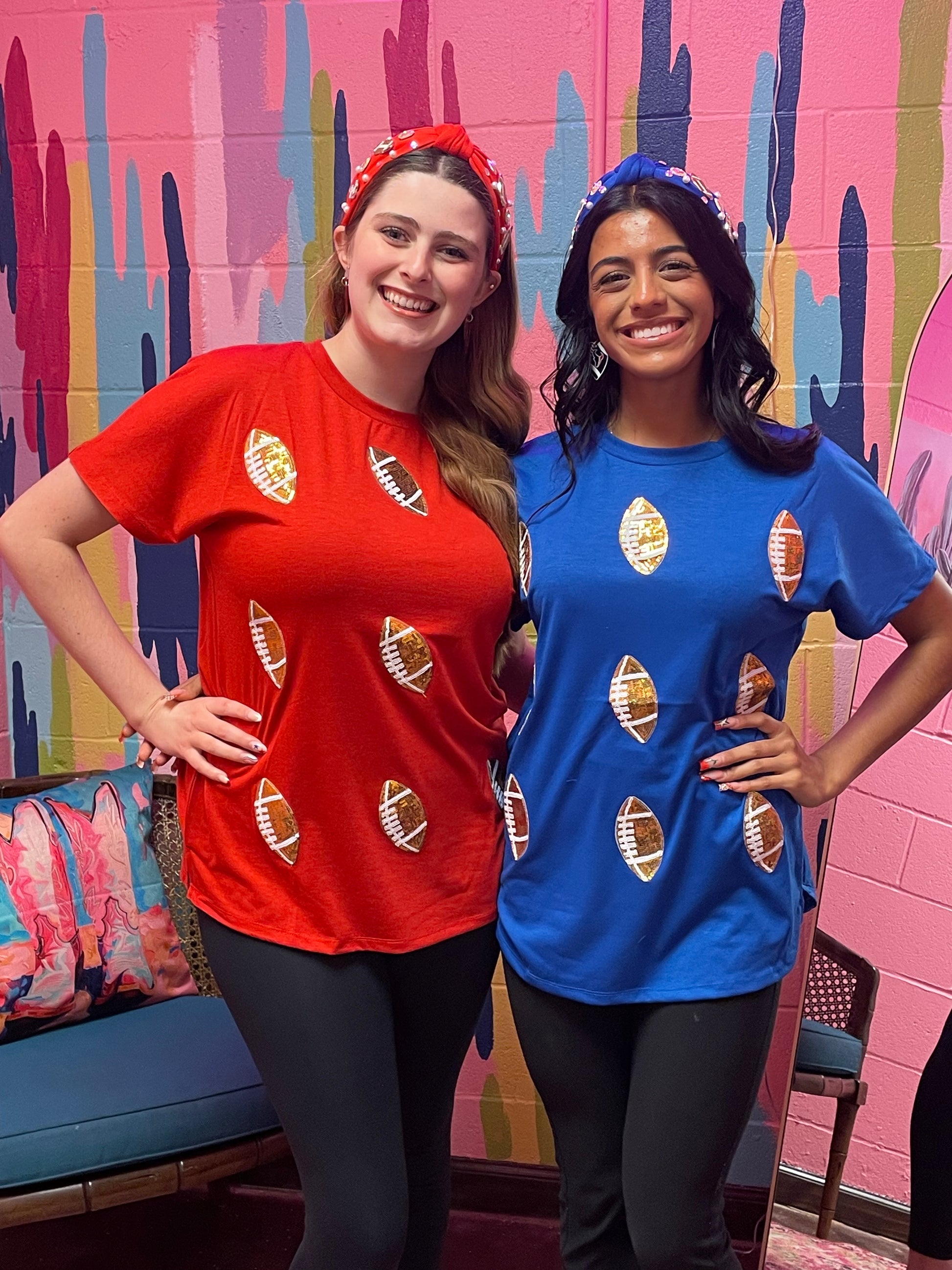 Score a touchdown in style with our Glitter Goals Sequin Football Tee! This game day glam top features shimmering sequin footballs for a touch of sparkle. Perfect for die-hard fans who want to show their love for the game with a hint of glamour.